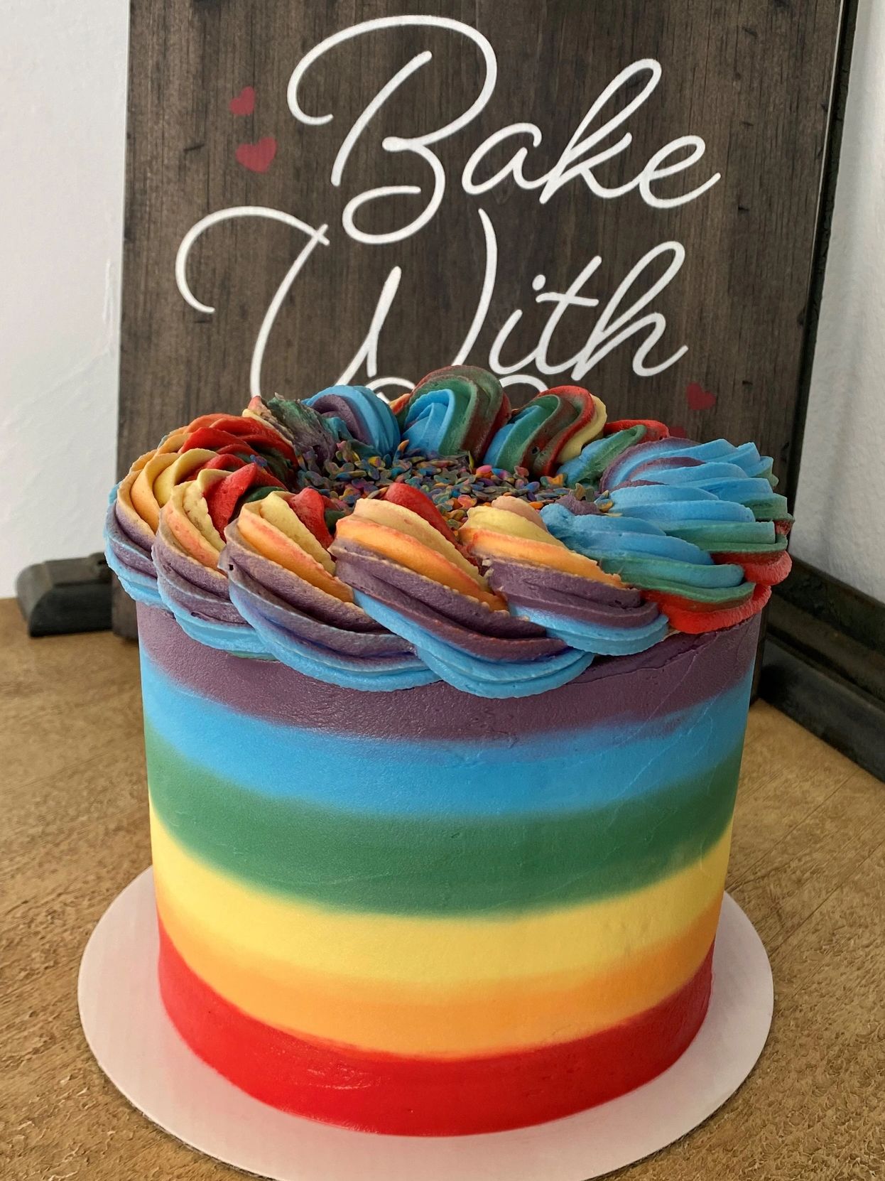 PRIDE Proud! A 6" round, three layer vanilla cake features our homemade vanilla buttercream icing depicting the rainbow pride colors. Choose any of our 25+ flavors!