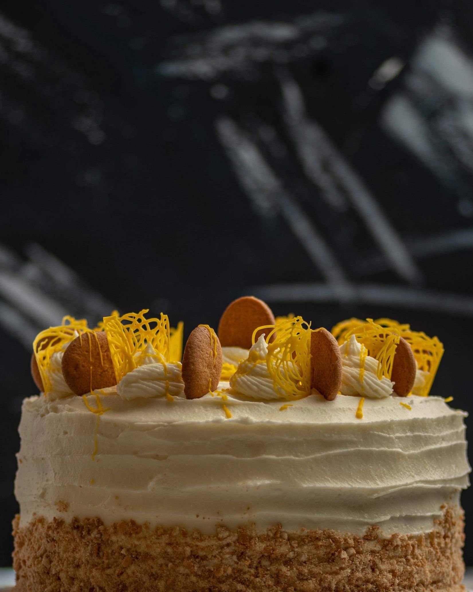 9" Three layer Banana Pudding Cake made with fresh bananas and our homemade banana pudding recipe. This decadent cake is wrapped in a banana cream cheese icing & garnished with homemade yellow chocolate designs and Nilla wafers with a Nilla wafer border.
