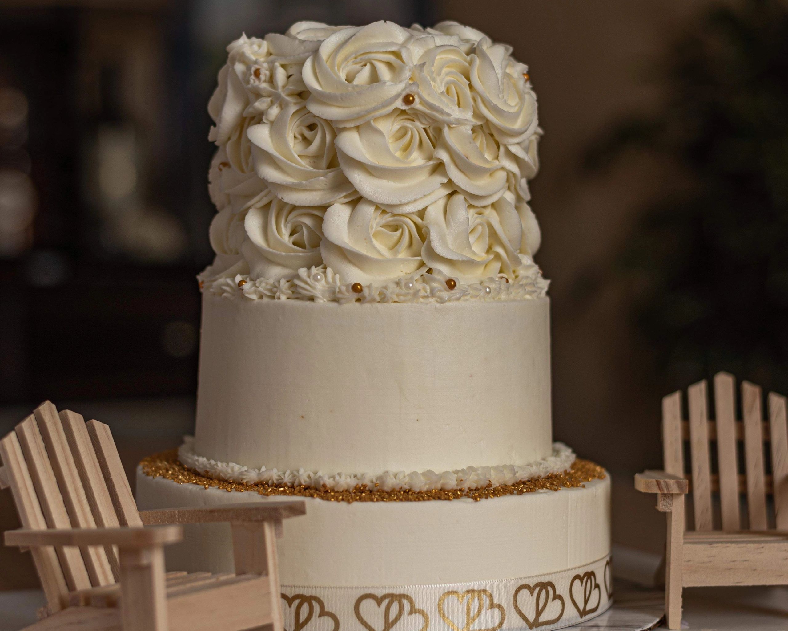 We adorned the top tier with beautifully piped rosettes. We tossed on a few brown and white pearls. The bottom tier is wrapped in a white ribbon with soft brown hearts.